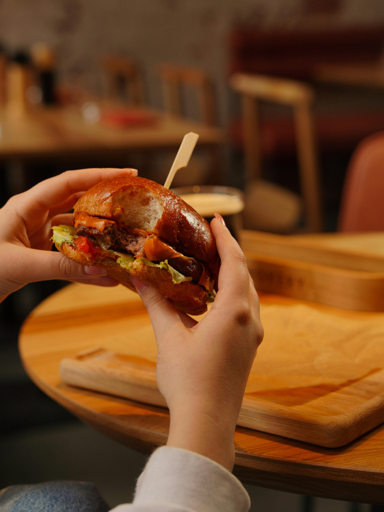 Wołowe burgery 🐄 – przygotowane z najwyższej jakości mięsa, z dodatkiem świeżych warzyw i autorskich sosów.